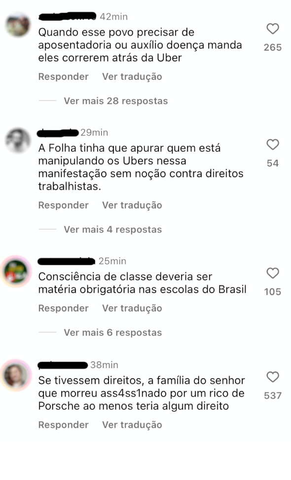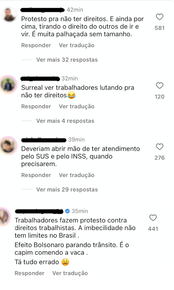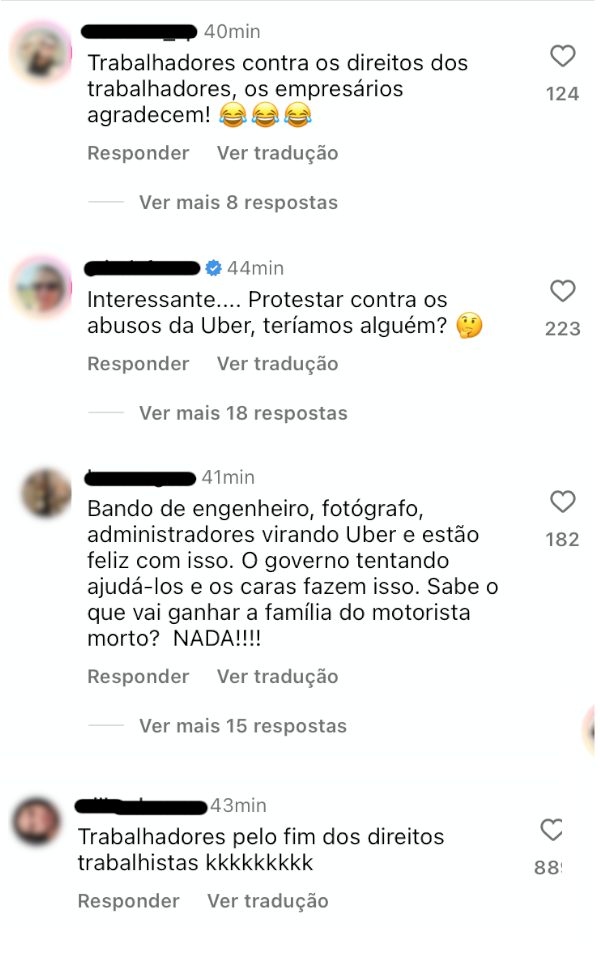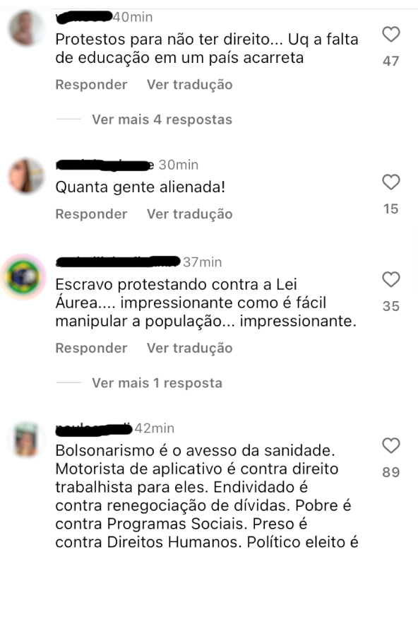 Nas redes sociais não faltam exemplos de como esse discurso está incutido em setores que se dizem defensores dos direitos trabalhistas, atribuindo ares de paternalismo ao governo que – segundo esta narrativa – está tentando “ajudá-los” ou até mesmo “promulgar a nova lei Áurea”. Os prints abaixo foram retirados de comentários no Instagram que divulgava matéria sobre a rejeição dos motoristas de aplicativos ao PLP 12/2024.