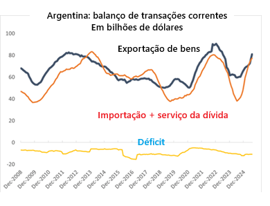 Javier Milei pode ter equilibrado o orçamento do governo, mas a motosserra fiscal não foi capaz de lidar com a fraqueza contínua observada na conta comercial. Sob Javier Milei, as exportações aumentaram um pouco, mas as importações também aumentaram, de tal modo que a receita líquida não cresceu. Por isso, o déficit de mensal em conta corrente aumentou, tal como mostra o gráfico em sequência.