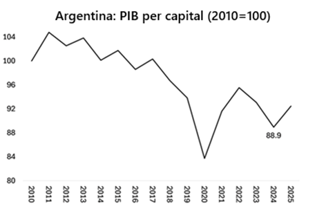 Isso que agora ocorre não é novidade na economia argentina; ao contrário, é apenas mais um episódio em uma história de crise sucessivas que vem de longe. O capitalismo argentino tem se mostrado claudicante. A economia basicamente estagnou desde o final da Grande Recessão em 2008, particularmente desde o fim do boom global dos preços das commodities em 2012. Nos 13 anos de 2012 a 2024, o crescimento médio real do PIB foi de apenas 0,1%.